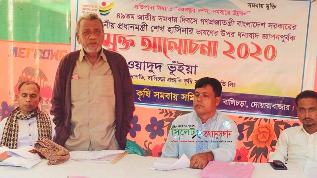 ৪৯ জাতীয় সমবায় দিবসে প্রধানমন্ত্রীর বক্তব্যের ওপর ধন্যবাদ জ্ঞাপন পূর্বক গ্রামীণ জনপদে সমবায় শক্তিকে আরও বেগবান করার লক্ষ্যে দোয়ারাবাজারে মুক্ত আলোচনা অনুষ্ঠিত হয়েছে। রোববার বিকেলে উপজেলার বোগলাবাজার ইউনিয়নের বালিছড়া গ্রামে ‘প্রভাতি কৃষি সমবায় সমিতি’র আয়োজনে সমিতির সভাপতি ওয়াদুদ ভুঁইয়ার সভাপতিত্বে ও কমরুল ইসলামের সঞ্চালনায় অনুষ্ঠিত আলোচনায় প্রধান আলোচক হিসেবে বক্তব্য রাখেন, জাতীয় কৃষক পার্টির সহসভাপতি আবাদি কৃষক নেতা আবদুল আওয়াল। আলোচনায় অংশগ্রহণ করেন কবি ও সাংবাদিক মুহাম্মদ হাবীবুল্লাহ হেলালী, প্রভাষক সামছুল হক।