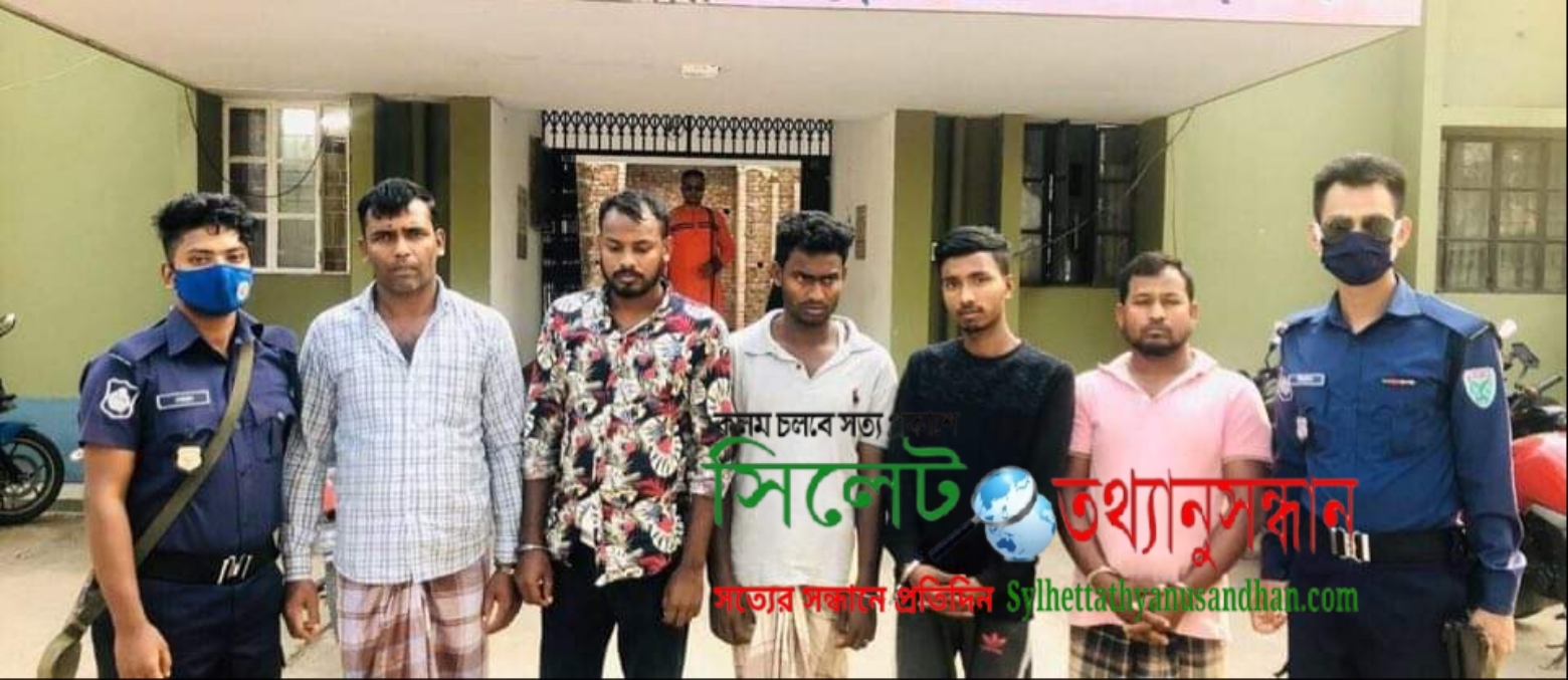 আটকৃতরা হলো, উপজেলার ইসলাম ইউনিয়নের রহমতপুর গ্রামের মৃত. নেছার আহমদের ছেলে রুহুল আমিন (৩৮), গণেশপুর গ্রামের আজিজুল হকের ছেলে চপল মিয়া (২০), সিলেটের কোম্পানীগঞ্জ উপজেলার ইছাকলস ইউনিয়নের ইছাকলস গ্রামের মৃত. জমির উদ্দিনের ছেলে ফরিদ মিয়া (৩৫), রুবেল মিয়া (২৪) একই গ্রামের সোনা মিয়ার ছেলে উজ্বল মিয়া (২৩)।