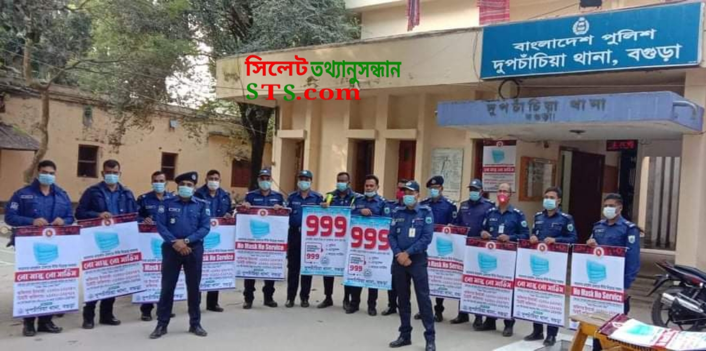 বগুড়ার দুপচাঁচিয়া উপজেলায় জেলা পুলিশ সুপার আলী আশরাফ ভূঞা বিপিএম(বার) এর নির্দেশনায় করোনা ভাইরাসের দ্বিতীয় ঢেউ প্রতিরোধে নো মাস্ক নো সার্ভিস বাস্তবায়নের লক্ষ্যে ২৬নভেম্বর বৃহস্পতিবার দুপচাঁচিয়া থানারপক্ষ থেকে উপজেলার ১২টি বিট পুলিশিং পয়েন্টে প্রায় ৬হাজার মাস্ক বিতরণ করা হয়েছে। এছাড়াও জনগণকে পুলিশের সেবা গ্রহণের লক্ষ্যে ৯৯৯ ব্যবহার করার জন্য সচেতনতামূলক ব্যানার ও ফেসটুন উপজেলার বিভিন্ন গুরুত্বপূর্ণস্থানে প্রদর্শন সহ স্থাপন করা হয়। দুপচাঁচিয়া থানার অফিসার ইনচার্জ(ওসি) হাসান আলী এ মাস্ক বিতরণ করেন। এসময় উপস্থিত ছিলেন পুলিশ পরিদর্শক(তদন্ত) সনাতন সরকার, থানার এসআই আব্দুস সালাম, এসআই নাসির, এসআই খোরশেদ আলম, এসআই রাশেদুল ইসলাম, এসআই খাইরুল ইসলাম, এসআই জাহাঙ্গীর আলম, এএসআই রতন রায়, কমল চন্দ্র, মামুন, মাহবুব, ইউসুফ সহ থানার কনস্টেবলবৃন্দ ।