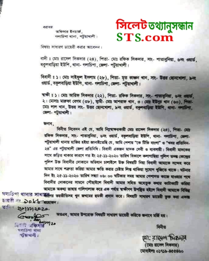আমি বৃহস্পতিবার সন্ধ্যায় আমার নিরাপত্তার জন্য গলাচিপা থানায় একটি সাধারণ ডায়েরী করি। যার ডায়েরী নং- ১০৮৮ তারিখ- ২৬/১১/২০২০। তিনি আরও বলেন, আমি পেশায় “কে টিভি বাংলা” ও “খবর প্রতিদিন ২৪” এর পটুয়াখালী জেলা প্রতিনিধি। এ বিষয়ে গলাচিপা থানার অফিসার ইনচার্জ (ওসি) মো. মনিরুল ইসলাম বলেন, এ বিষয় নিয়ে গলাচিপা থানায় একটি সাধারণ ডায়েরী করা হয়েছে।