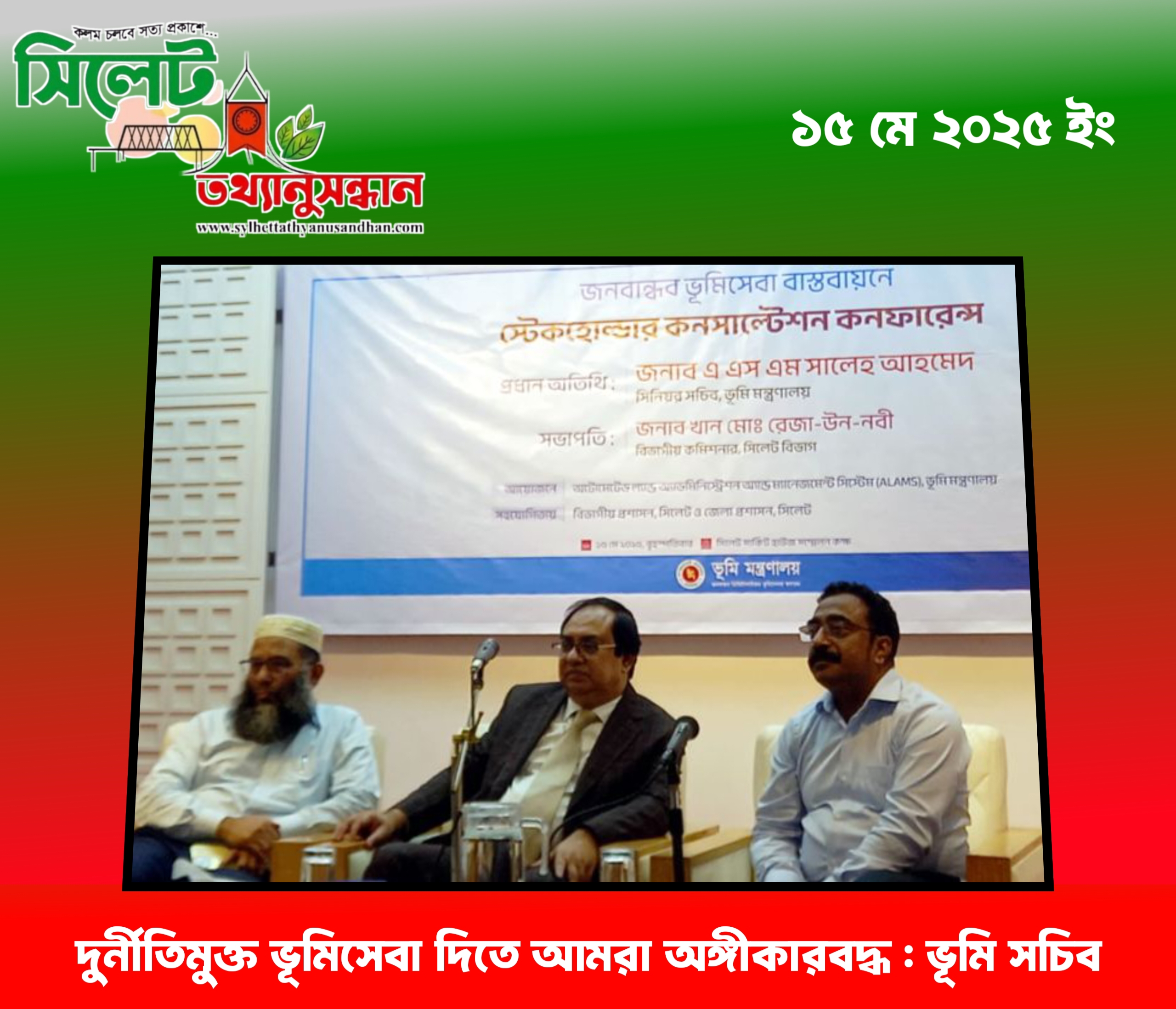 সিলেটে জনবান্ধব ভূমিসেবা বাস্তবায়নে স্টেকহোল্ডার কনসাল্টেশন কনফারেন্স অনুষ্ঠিত হয়েছে। বৃহস্পতিবার (১৫ মে) সিলেট সার্কিট হাউজ সম্মেলন কক্ষে অটোমেটেড ল্যান্ড অ্যাডমিনিস্ট্রেশন অ্যান্ড ম্যানেজমেন্ট সিস্টেম ভূমি মন্ত্রণালয়ের আয়োজনে সিলেট বিভাগীয় প্রশাসন ও জেলা প্রশাসনের সহযোগিতায় অনুষ্ঠিত হয়।