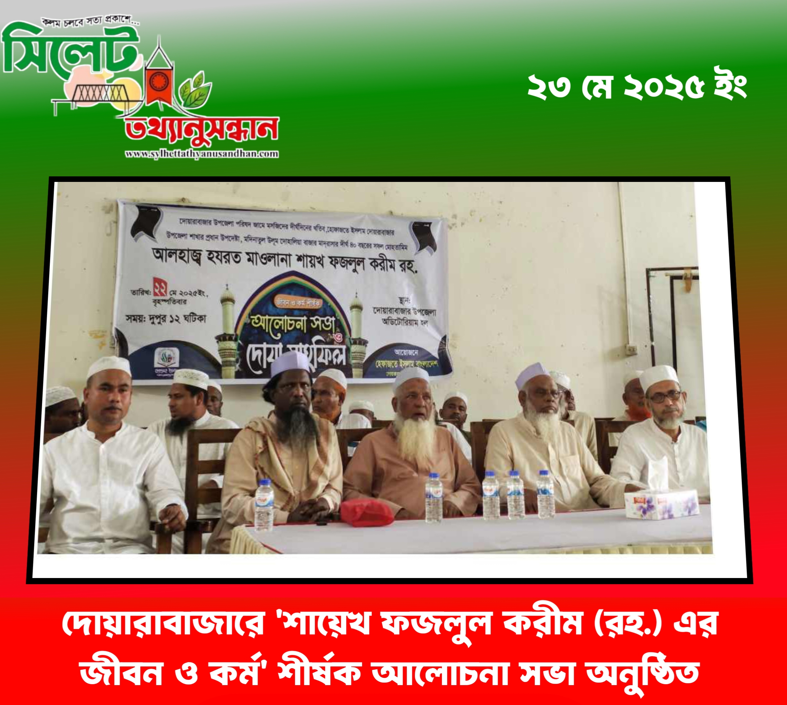 সুনামগঞ্জের দোয়ারাবাজারে হেফাজতে ইসলাম বাংলাদেশের উদ্যোগে ‘শায়খ ফজলুল কীরম (রহ.) এর জীবন ও কর্ম শীর্ষক আলোচনা সভা ও দোয়া মাহফিল অনুষ্ঠিত হয়েছে।