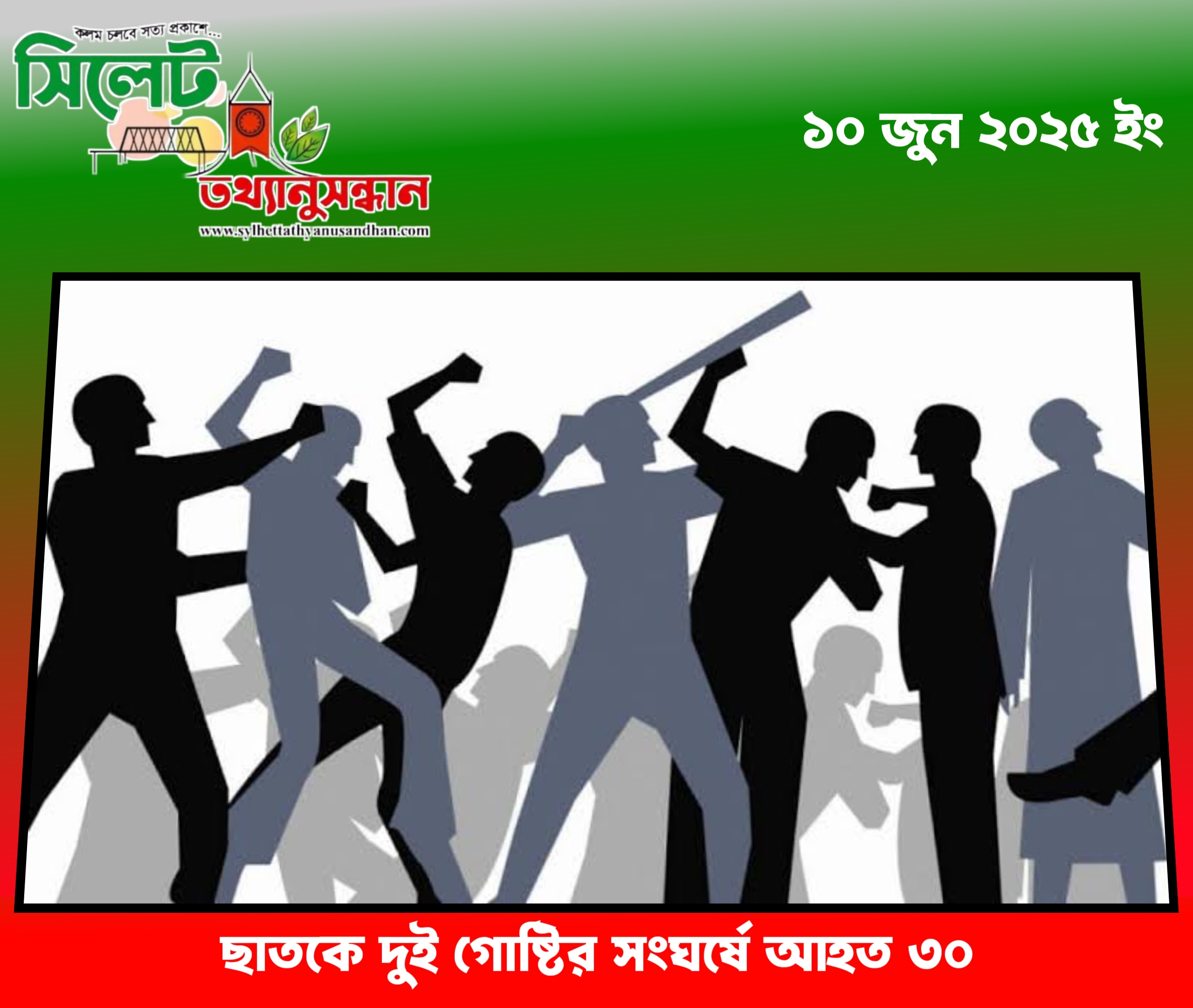 সুনামগঞ্জের ছাতকে মামা-ভাগনার গোষ্টির মধ্যে সংঘর্ষে অন্তত ৩০ জন ব্যক্তি আহত হওয়ার খবর পাওয়া গেছে।গতকাল বুধবার সকাল ৭ টার দিকে উপজেলার উত্তর খুরমা ইউনিয়নের আমেরতল গ্রামে এ সংঘর্ষের ঘটনা ঘটে।