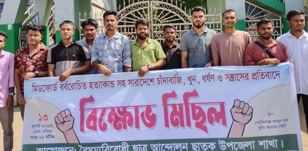 সারা দেশে ক্রমবর্ধমান সহিংসতা, চাঁদাবাজি, খুন, ধর্ষণ এবং সাম্প্রতিক মিডফোর্ট হত্যাকাণ্ডের প্রতিবাদে আজ সুনামগঞ্জের ছাতকে এক বিশাল বিক্ষোভ মিছিল অনুষ্ঠিত হয়েছে। রবিবার (১৩ জুলাই) দুপুরে ছাতক উপজেলার গোবিন্দগঞ্জ আব্দুল হক স্মৃতি কলেজ গেইট থেকে এই বিক্ষোভ মিছিল শুরু হয়। বৈষম্যবিরোধী ছাত্র আন্দোলন, ছাতক উপজেলা শাখা -এর ব্যানারে আয়োজিত এই মিছিলে শিক্ষার্থী, পেশাজীবী, রাজনৈতিক কর্মীসহ নানা শ্রেণি-পেশার মানুষ অংশ নেন। অংশগ্রহণকারীরা হাতে প্ল্যাকার্ড ও ব্যানার নিয়ে নির্মম হত্যাকাণ্ডের প্রতিবাদ জানান এবং সারাদেশে চলমান অপরাধের বিরুদ্ধে ঐক্যবদ্ধ প্রতিরোধ গড়ে তোলার আহ্বান জানান।