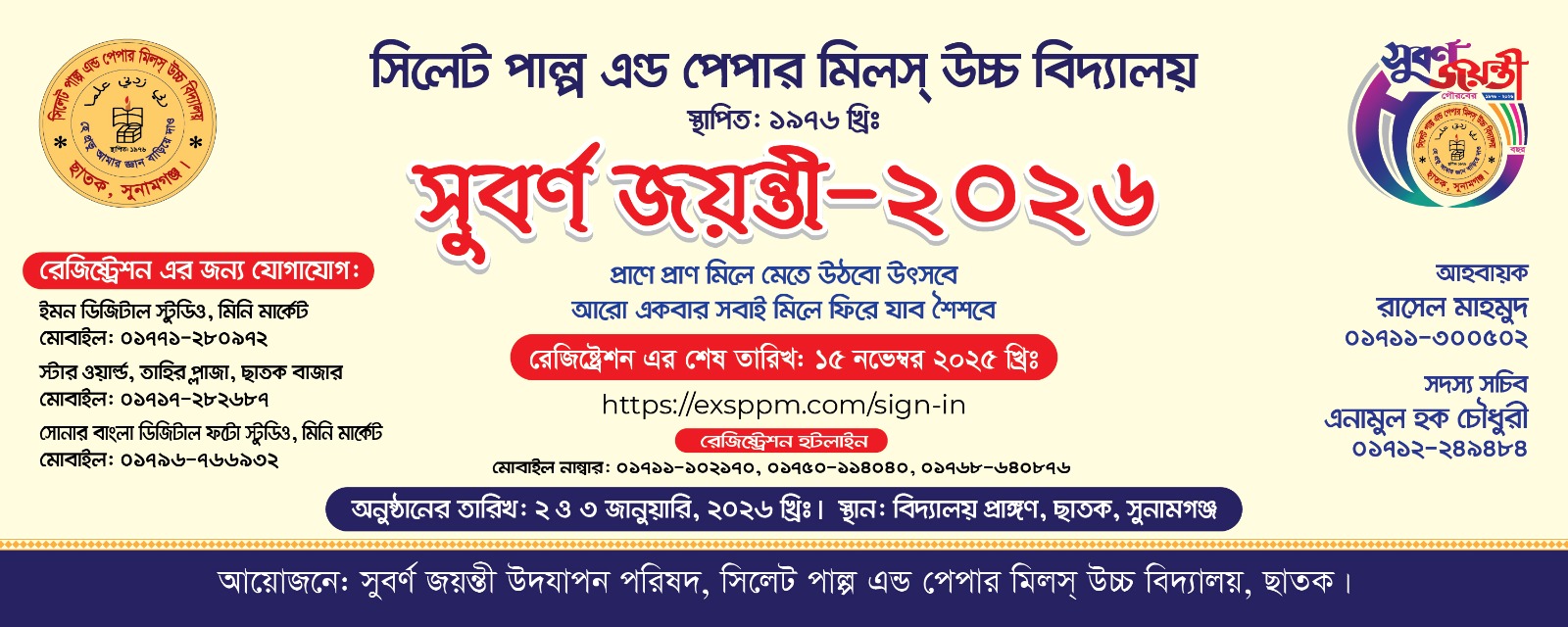 সিলেট পাল্প এন্ড পেপার মিলস্ উচ্চ বিদ্যালয় তার গৌরবোজ্জ্বল ৫০ বছরের যাত্রাপথ পূর্ণ করেছে। এ উপলক্ষে আগামী ২ ও ৩ জানুয়ারি ২০২৬ ইংরেজি এক জমকালো অনুষ্ঠানের মধ্য দিয়ে হতে যাচ্ছে সুবর্ণ জয়ন্তী উদযাপন অনুষ্ঠান।