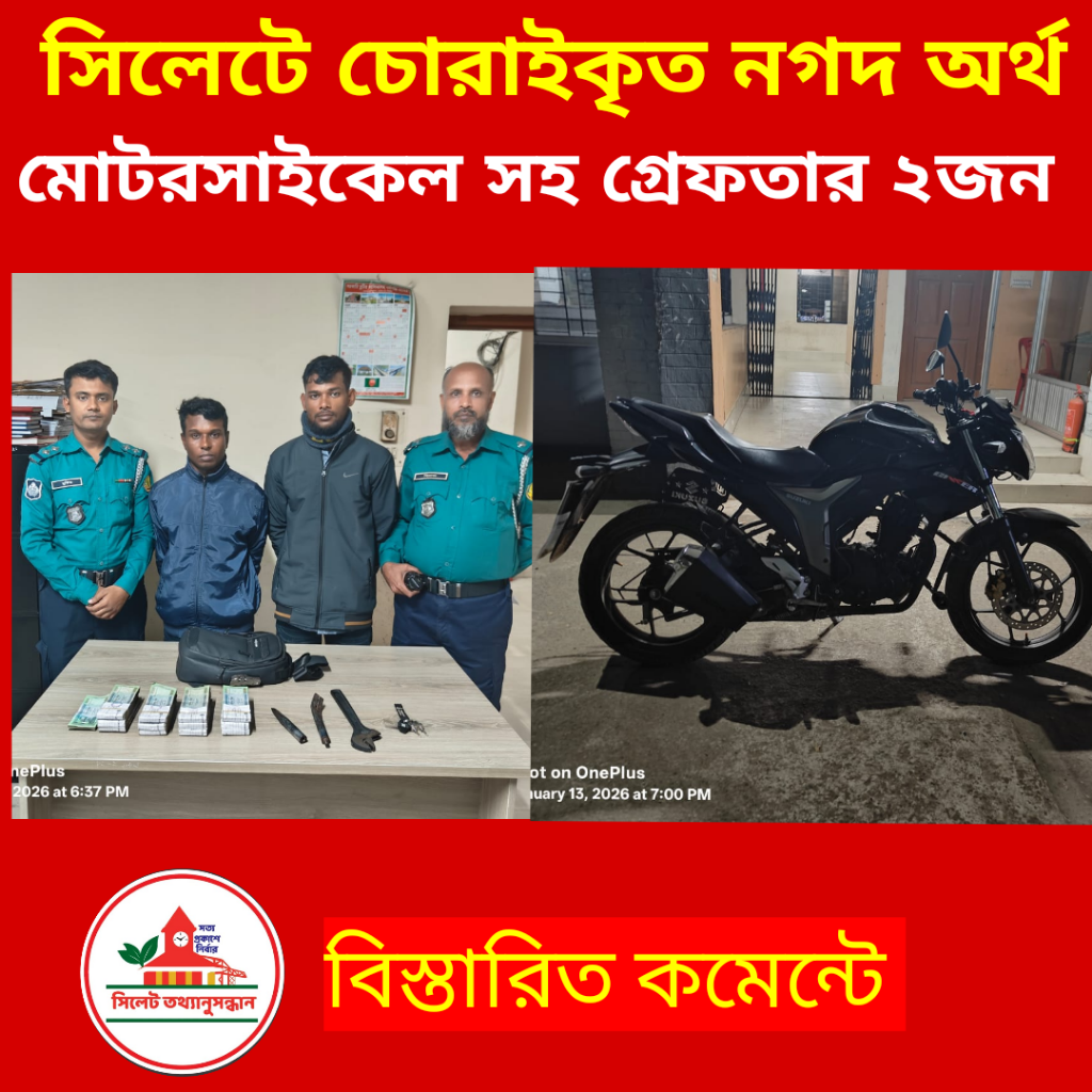 সিলেটে চোরাই মোটরসাইকেল, নগদ অর্থ ও চোরাই কাজে ব্যবহৃত বিভিন্ন সরঞ্জামসহ দুইজনকে গ্রেফতার করেছে কোতোয়ালী মডেল থানা পুলিশ।