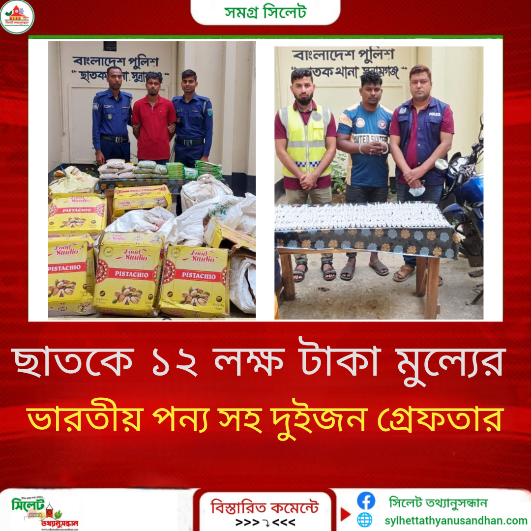 সুনামগঞ্জের ছাতকে পৃথক দুটি অভিযানে প্রায় ১২ লক্ষাধিক টাকার ভারতীয় প্রসাধনী ও মসলা জব্দ করেছে পুলিশ। এ ঘটনায় দুইজনকে আটক করা হয়েছে।