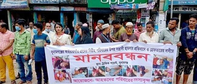 শনিবার দুপুর ১২টায় আহত পরিবার ও তাদের স্বজনের উদ্যোগে শহরের ট্রাফিক পয়েন্টে এ মানববন্ধন অনুষ্ঠিত হয়। সমাজসেবক এম তাজুল ইসলাম তারেকের সভাপতিত্বে এ সময় বক্তব্য রাখেন, সুনামগঞ্জ জেলা শ্রমিক ঐক্য পরিষদের সভাপতি মো. সুহেল আহমদ, জেলা বঙ্গবন্ধু সৈনিকলীগের সভাপতি মো. আবুল মনসুর জমশেদ, সার্চ মানবাধিকার সোসাইটির সভাপতি একে মিলন আহমদ, জেলা যুব মহিলালীগের সভাপতি সানজিদা নাসরিন দিনা ডায়না,যুব মহিলালীগের নেত্রী মাহিন চৌধুরী,মো. ফরিদ মিয়া,মানবাধিকার কর্মী কেএম শহীদুল,নুরুল ইসলাম নুরুলসহ এলাকার বিভিন্ন শ্রেণীপেশার লোকজন মানববন্ধনে অংশগ্রহন করেন।