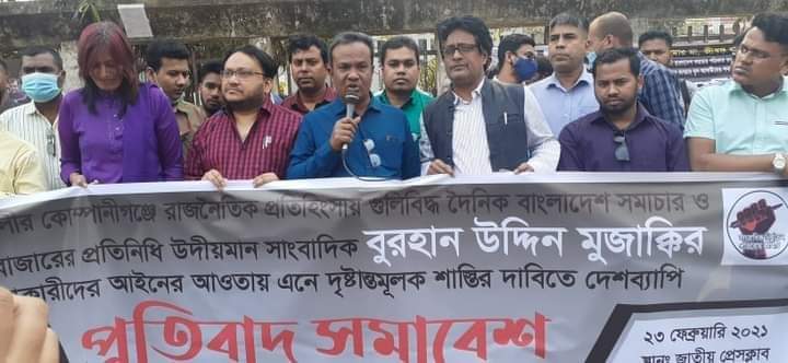 গুলিবিদ্ধ উদীয়মান তরুণ সাংবাদিক বুরহান উদ্দিন মুজাক্কির হত্যাকারীদের দ্রুত বিচার আইনে গ্রেফতার ও দৃষ্টান্তমূলক বিচার দাবি করা হয়েছে। দেশব্যাপী কর্মসূচির অংশ হিসেবে বাংলাদেশ মফস্বল সাংবাদিক ফোরামের ঢাকা জেলার আয়োজনে জাতীয় প্রেস ক্লাবের সামনে সকাল ১১টায় অনুষ্ঠিত প্রতিবাদ সমাবেশে এ দাবি করা হয়।